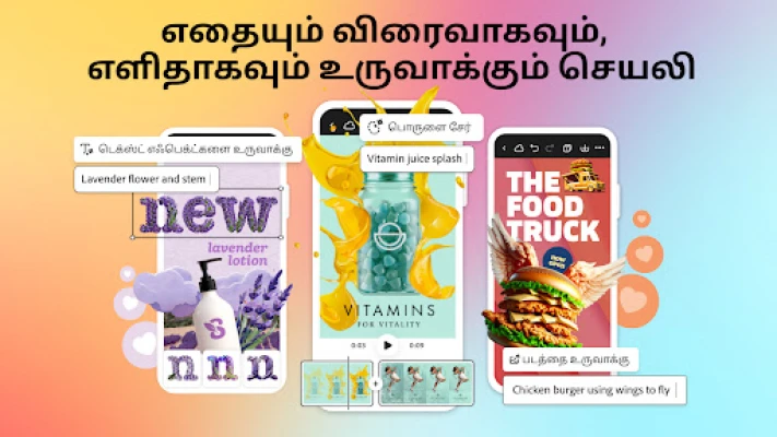 இந்த செயலி மூலம் கவர்ச்சிகரமான இடுகைகள், அழகிய படங்கள், சுவாரஸ்யமான வீடியோக்கள் மற்றும் கண்கவர் ஃபிளையர்களை மிக விரைவாகவும் எளிதாகவும் உருவாக்கலாம். உங்கள் படைப்பாற்றலை வெளிப்படுத்துங்கள்.
